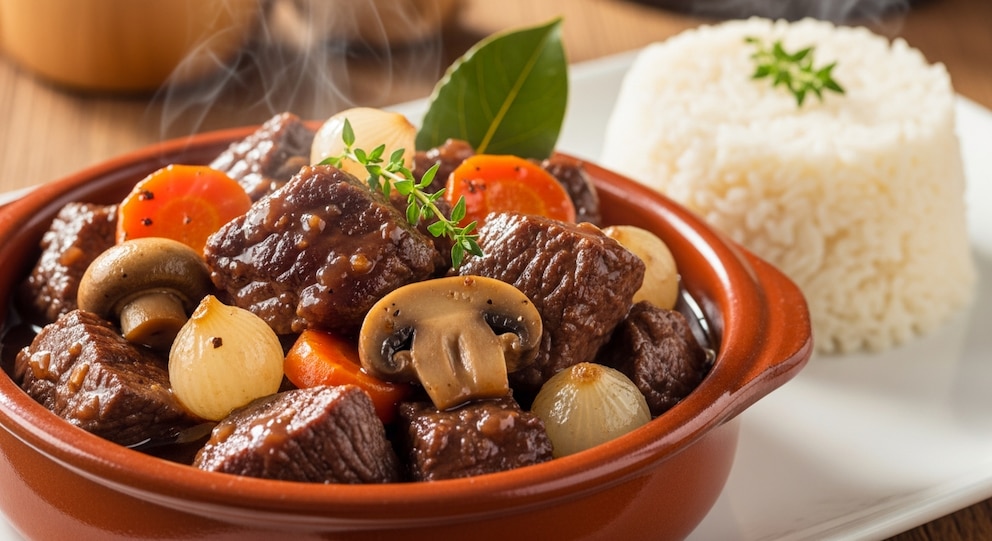 Inspirado en el clásico francés, este guiso se arma con carne para guiso, verdeo, zanahoria, champiñones y hierbas como tomillo y laurel. El vino tinto es protagonista y aporta profundidad y cuerpo al plato.