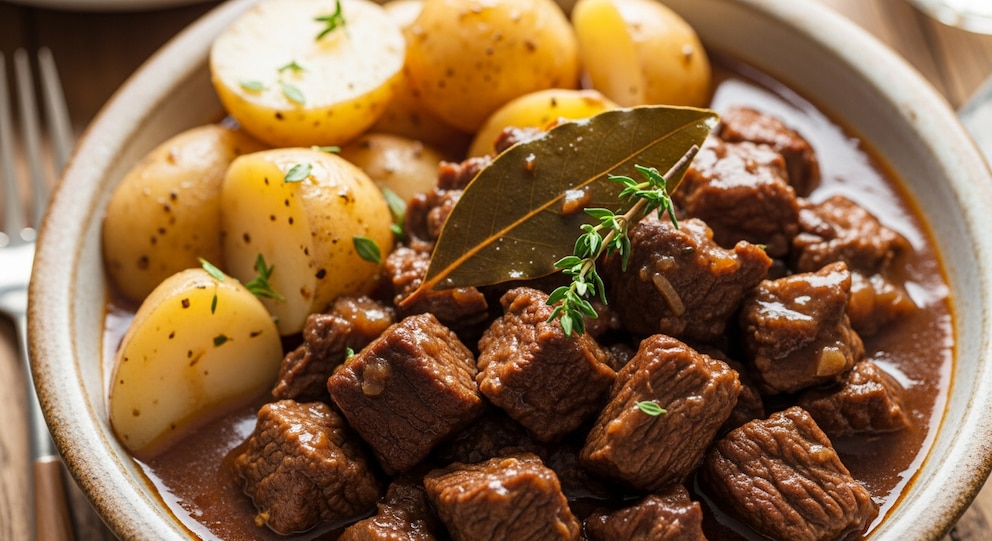 La guarnición de papas al vapor, simples y suaves, acompaña sin competir y permite disfrutar todo el sabor del guiso. Un plato bien argentino, de esos que se repiten invierno tras invierno.
