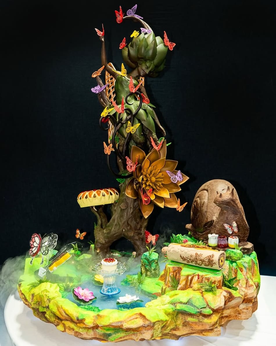 Uno de los grandes impactos visuales de la competencia fue la escultura de chocolate inspirada en el jardín de mariposas. Minuciosa, detallada y delicada, fue celebrada por el jurado tanto por su precisión técnica como por su referencia directa a la naturaleza.