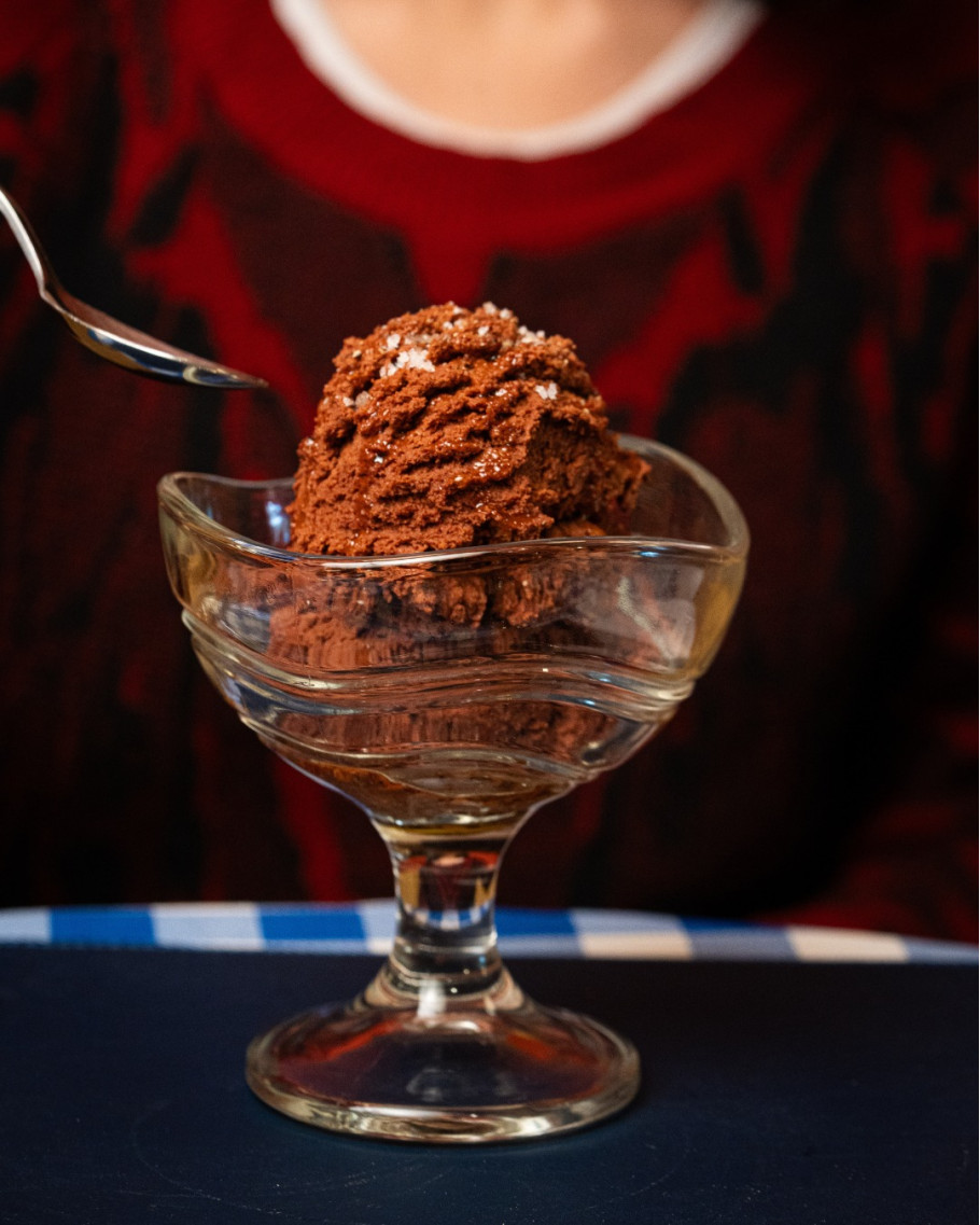 El lugar está dividido en dos niveles. En la planta baja, el ambiente es íntimo y acogedor, ideal para grupos chicos o parejas. En el primer piso, la luz natural se cuela por un gran ventanal que da a un balcón, donde se destaca una mesa comunal pensada para compartir comidas y charlas.