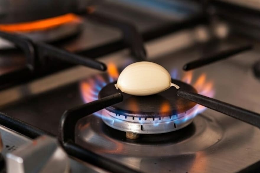 Primero, se aplasta una cabeza de ajo para separar los dientes. Luego, se toma uno y se lo coloca directamente sobre la hornalla.