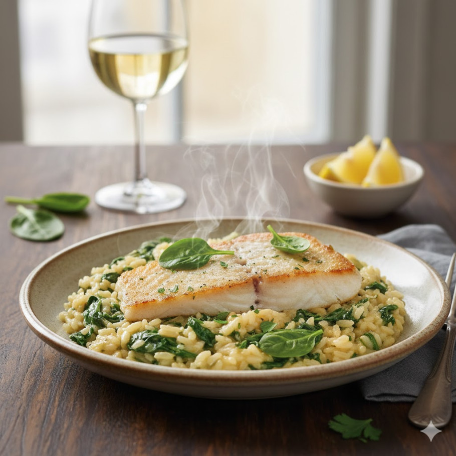Sobre el final de la cocción se agregan las espinacas para que mantengan color y frescura. La merluza se pasa por harina, se fríe y se sirve encima del arroz.