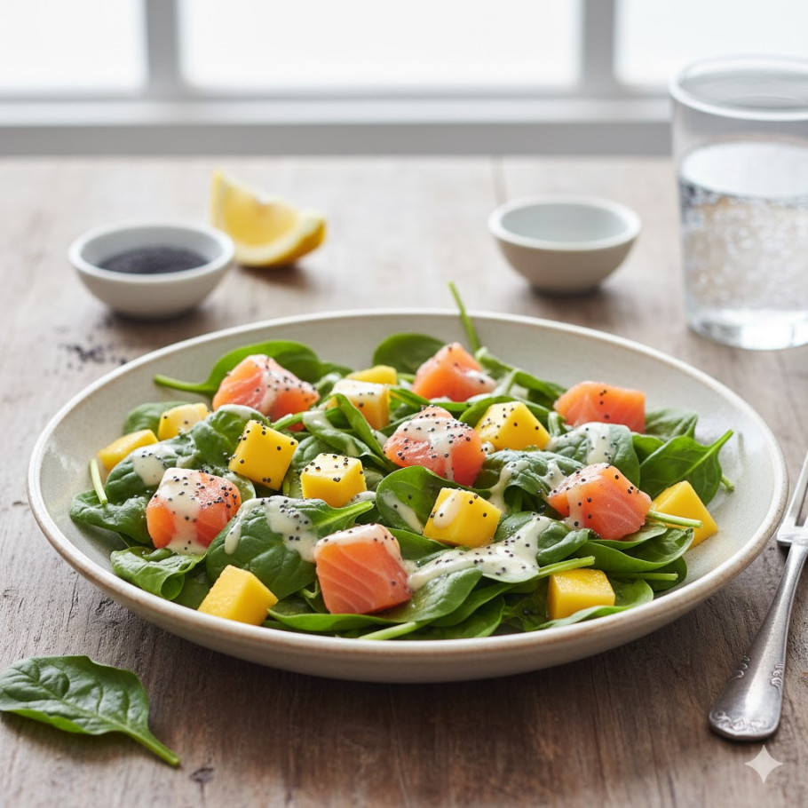 El contraste entre lo fresco de la hoja verde, lo intenso del salmón y el toque dulce del mango convierte esta ensalada en una opción liviana pero con personalidad.