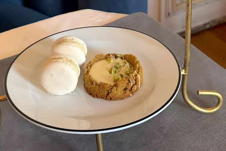 En Retiro, dentro del imponente Palacio Paz, Croque Madame sumó una cookie de pistachos que se volvió un imprescindible de su merienda premium. La propuesta combina una masa suave con una superficie levemente crocante, un corazón húmedo y un relleno de chocolate blanco que aporta cremosidad. El pistacho en trocitos termina de equilibrar dulzor, aromas y notas tostadas.