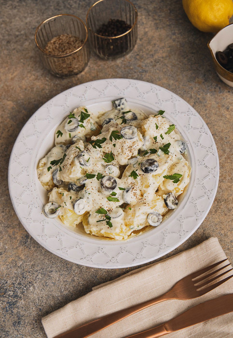 Una vuelta más liviana a la ensalada clásica. El yogur reemplaza parte de la mayonesa y aporta frescura, manteniendo una textura cremosa. Es rápida, se puede hacer con anticipación y aguanta bien en la heladera. Ideal para sumar verduras crocantes y hierbas frescas.