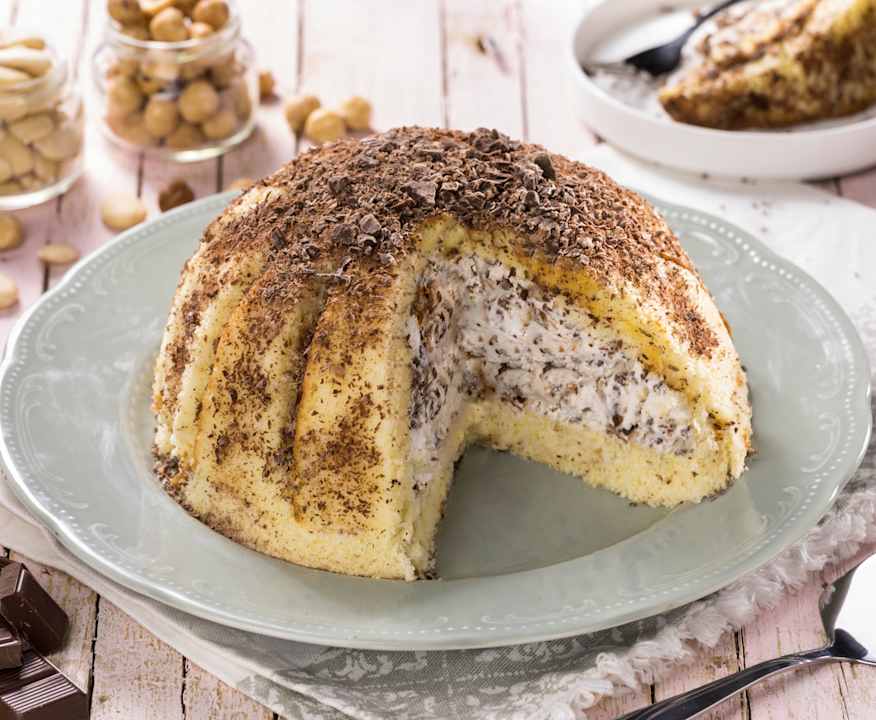 Este dulce se caracteriza por su forma abovedada, como si fuera una pequeña tarta helada. La estructura se arma con pionono o bizcochuelo remojado en licor, mientras que en el interior aparece un relleno cremoso con ricotta, crema batida, chocolate y frutos secos. Una combinación que pisa fuerte entre quienes buscan sabores clásicos con un toque festivo.