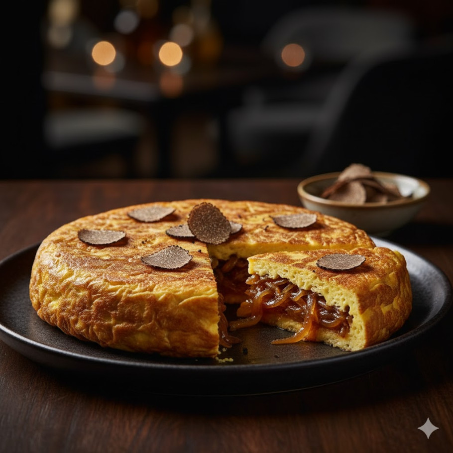 Cuando la tortilla se viste de gala, aparecen ingredientes como la cebolla caramelizada y la trufa. La dulzura intensa de la cebolla se combina con el aroma profundo y elegante de la trufa, logrando una receta más refinada.